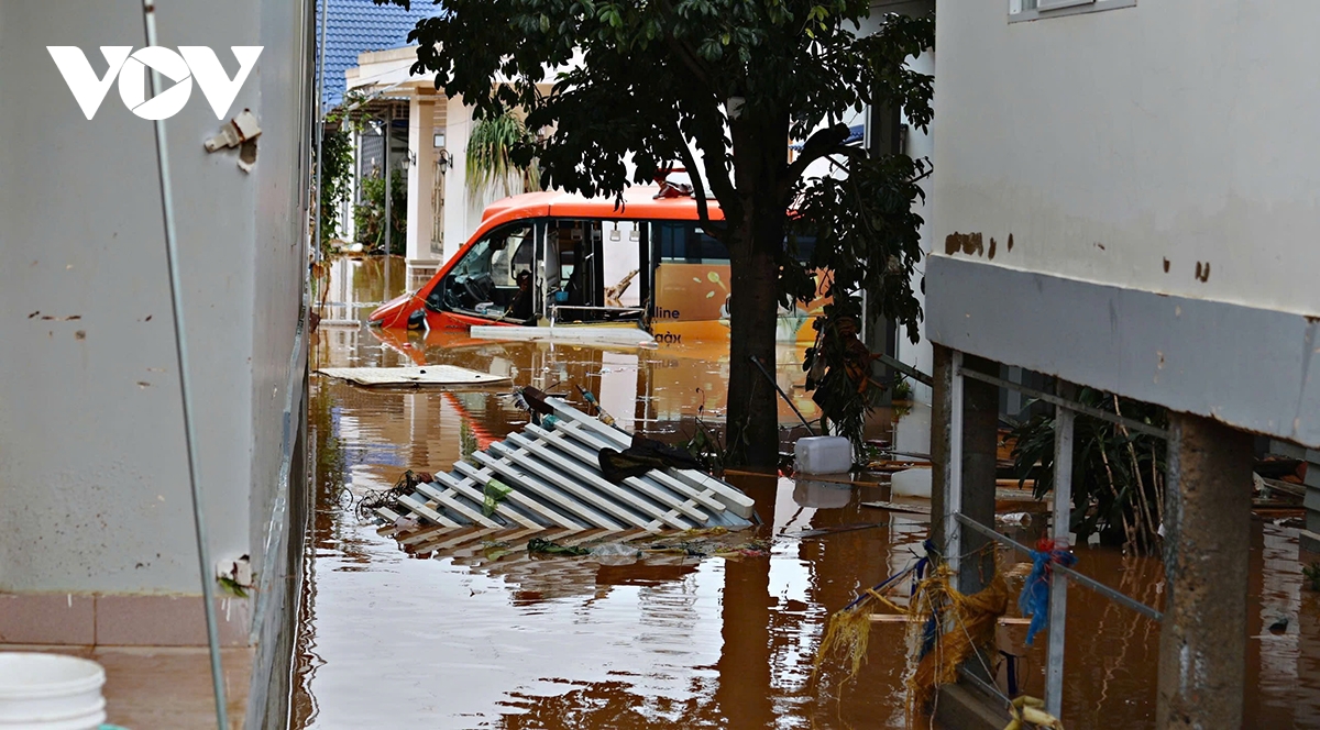 Nhiều phương tiện bị nước lũ cuốn trôi, mắc kẹt giữa các khu nhà; bùn đất phủ dày khắp nơi, cho thấy sức tàn phá của dòng nước lũ.