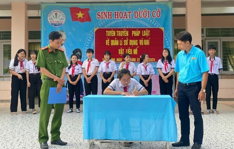 Học sinh Trường THCS Tân Thuận ký cam kết chấp hành các quy định của pháp luật về pháo