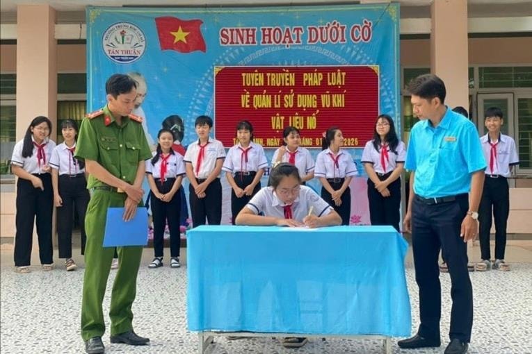 Công an xã Tân Thành phối hợp với Trường THCS Tân Thuận tổ chức tuyên truyền pháp luật về vũ khí, vật liệu nổ, công cụ hỗ trợ và pháo cho cán bộ, giáo viên và học sinh. Thông qua tuyên truyền, học sinh được nâng cao nhận thức về mức độ nguy hiểm của các hành vi vi phạm, đồng thời nắm bắt các quy định pháp luật mới liên quan đến xử phạt vi phạm hành chính trong lĩnh vực an ninh, trật tự, góp phần giữ gìn môi trường học đường an toàn.