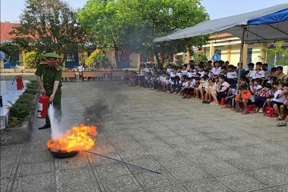 Lực lượng Công an xã hướng dẫn các em học sinh sử dụng bình chữa cháy