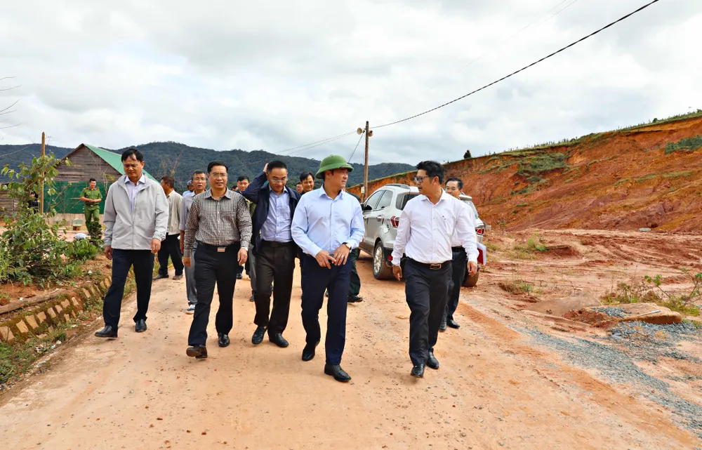 Ông Lê Trọng Yên, Phó Chủ tịch UBND tỉnh Lâm Đồng (đội mũ cối) cùng lãnh đạo sở, ngành, địa phương kiểm tra tình hình sạt lở tại khu định cư Đưng K'Nớ 5 ngày 22-10.
