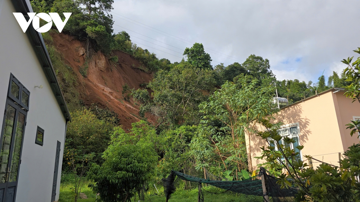 Vị trí sạt lở taluy phía sau khu dân cư ở xã D’Ran, đất đá trượt xuống sát nhà dân sau nhiều ngày mưa lớn.