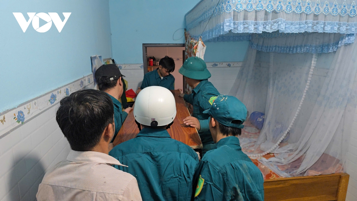 Lực lượng dân quân hỗ trợ người dân di chuyển tài sản ra khỏi khu vực có nguy cơ sạt lở trong tối 23/11.
