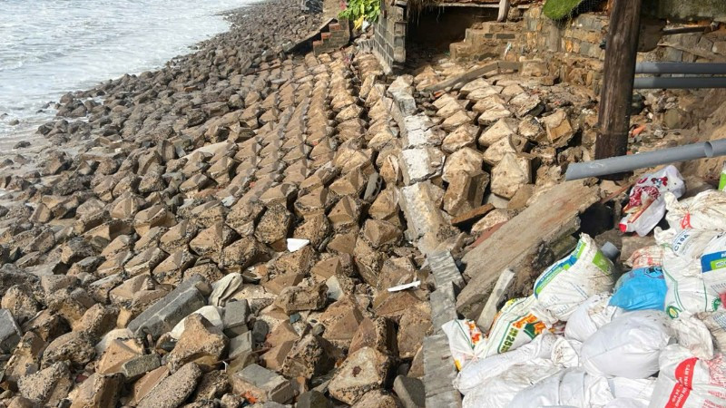 Đoạn kè phường Mũi Né bị hư hỏng nghiêm trọng vào sáng 28/11.