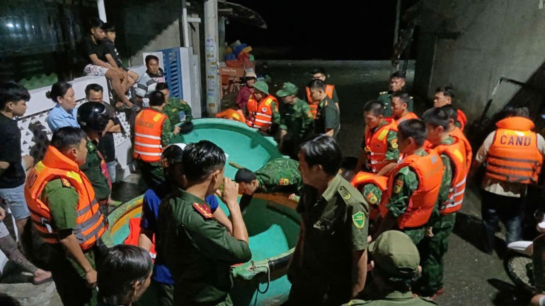 Lực lượng chức năng xã Liên Hương di dời khoảng 200 hộ dân trong đêm.
