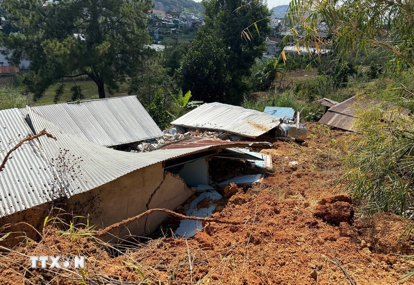 Căn nhà của một hộ dân tại thôn Quảng Hiệp (xã Hiệp Thạnh, tỉnh Lâm Đồng), khu vực phía sau nhà máy thủy điện Quảng Hiệp bị đất đá sạt lở làm sập một phần. (Ảnh: Nguyễn Dũng/TTXVN)