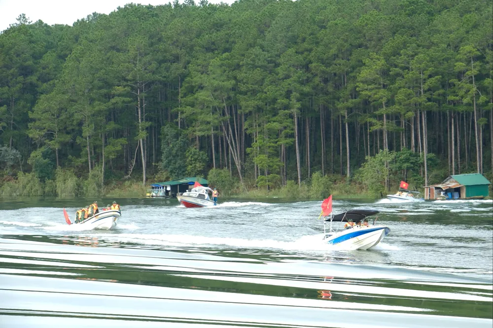 Các lực lượng tham gia diễn tập trên hồ Tuyền Lâm thuộc khu du lịch quốc gia hồ Tuyền Lâm.