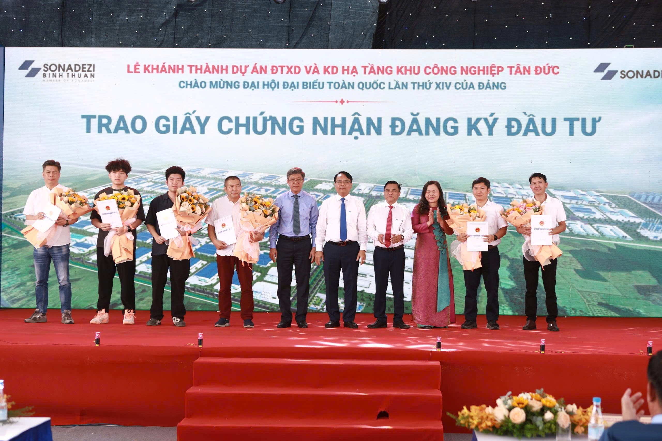 Đại diện 6 nhà đầu tư được trao giấy chứng nhận đầu tư tại buổi lễ khánh thành KCN Tân Đức. Ảnh: Quang Phương