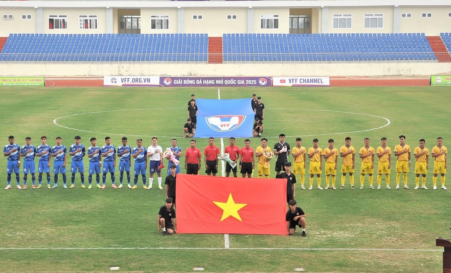 Lễ chào cờ trong trận khai mạc mùa giải hạng Nhì quốc gia 2025 trên sân nhà Đà Lạt khi Lâm Đồng gặp Đắk Lắk