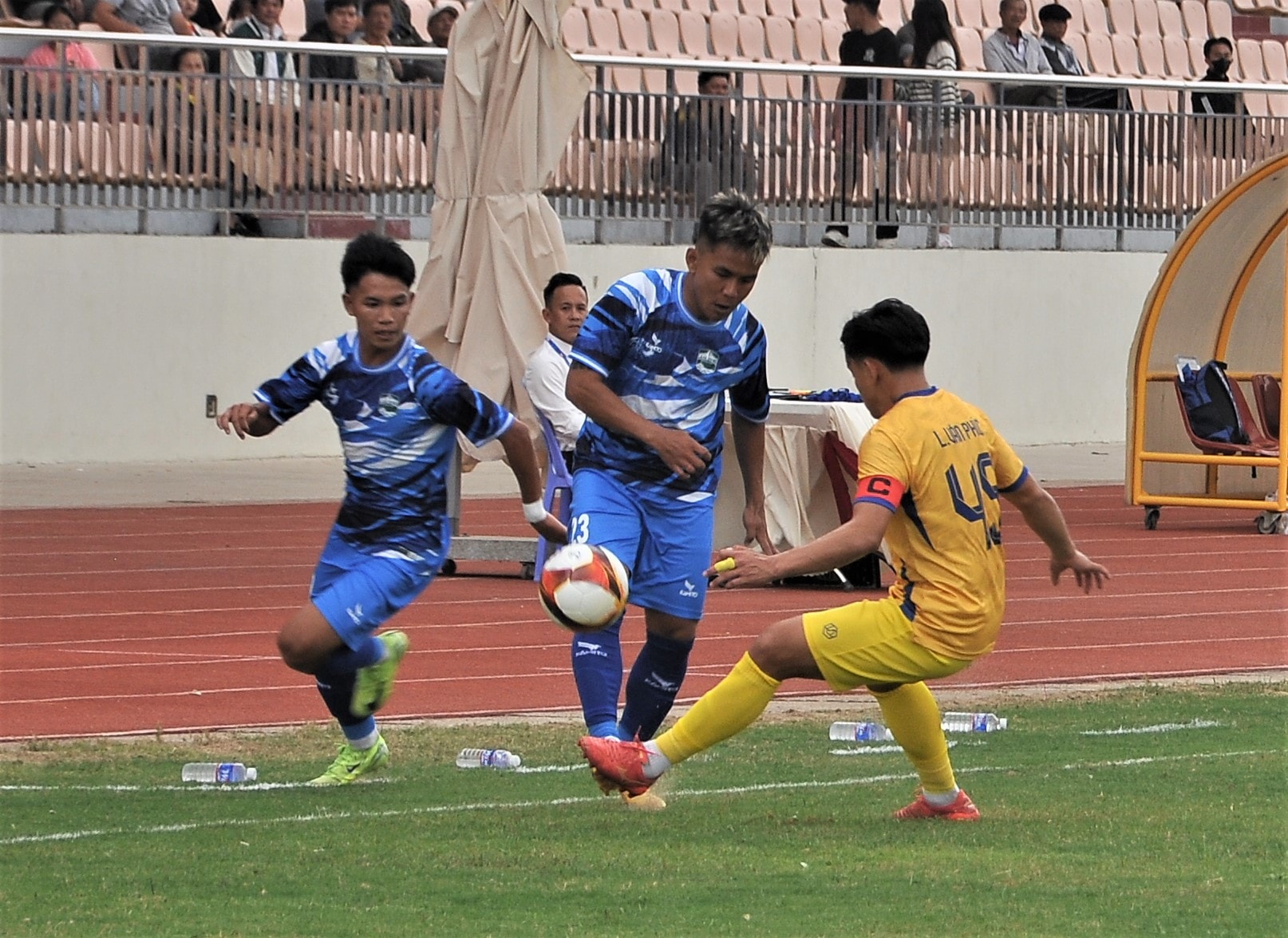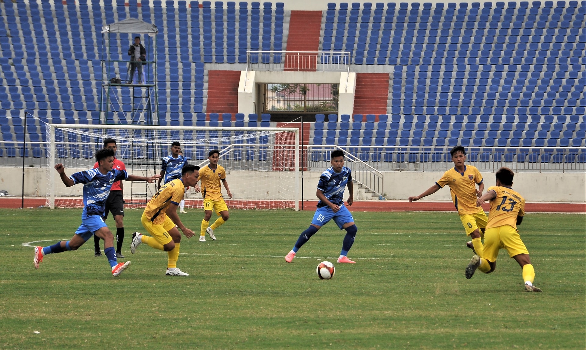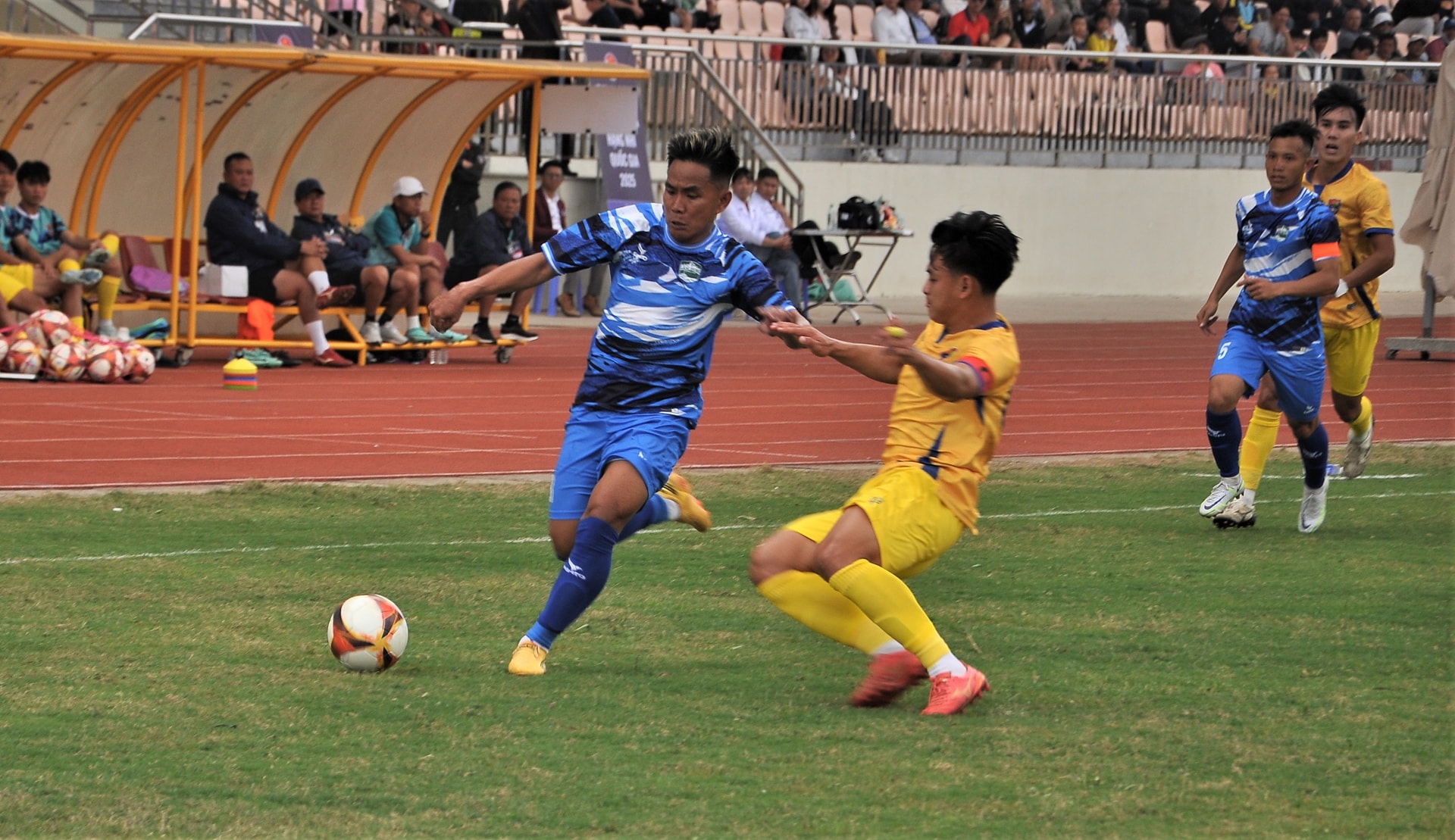 Cầu thủ Lâm Đồng (áo xanh) đi bóng trong trận gặp đội Đắk Lắk ( áo vàng) trong trận khai mạc hạng Nhì quốc gia năm 2025