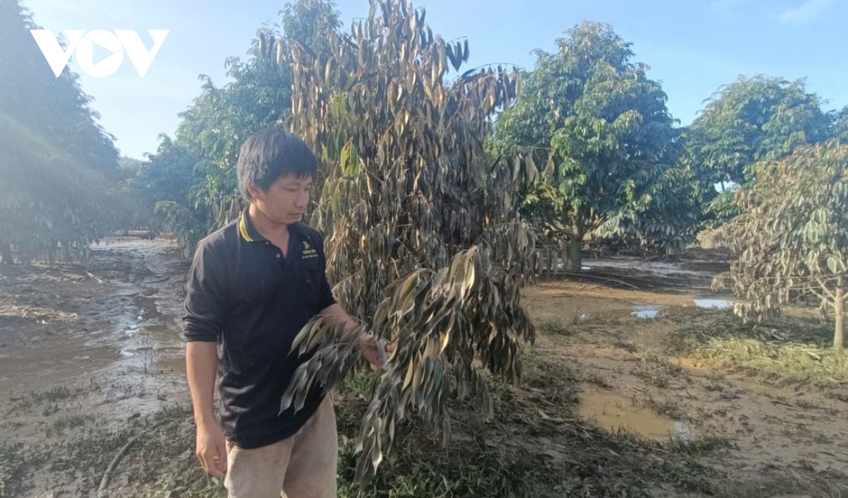 Anh Nguyễn Thành Trung, Thôn 1, xã Cát Tiên, tỉnh Lâm Đồng trong sầu riêng bị ngập úng nhiều ngày của gia đình.