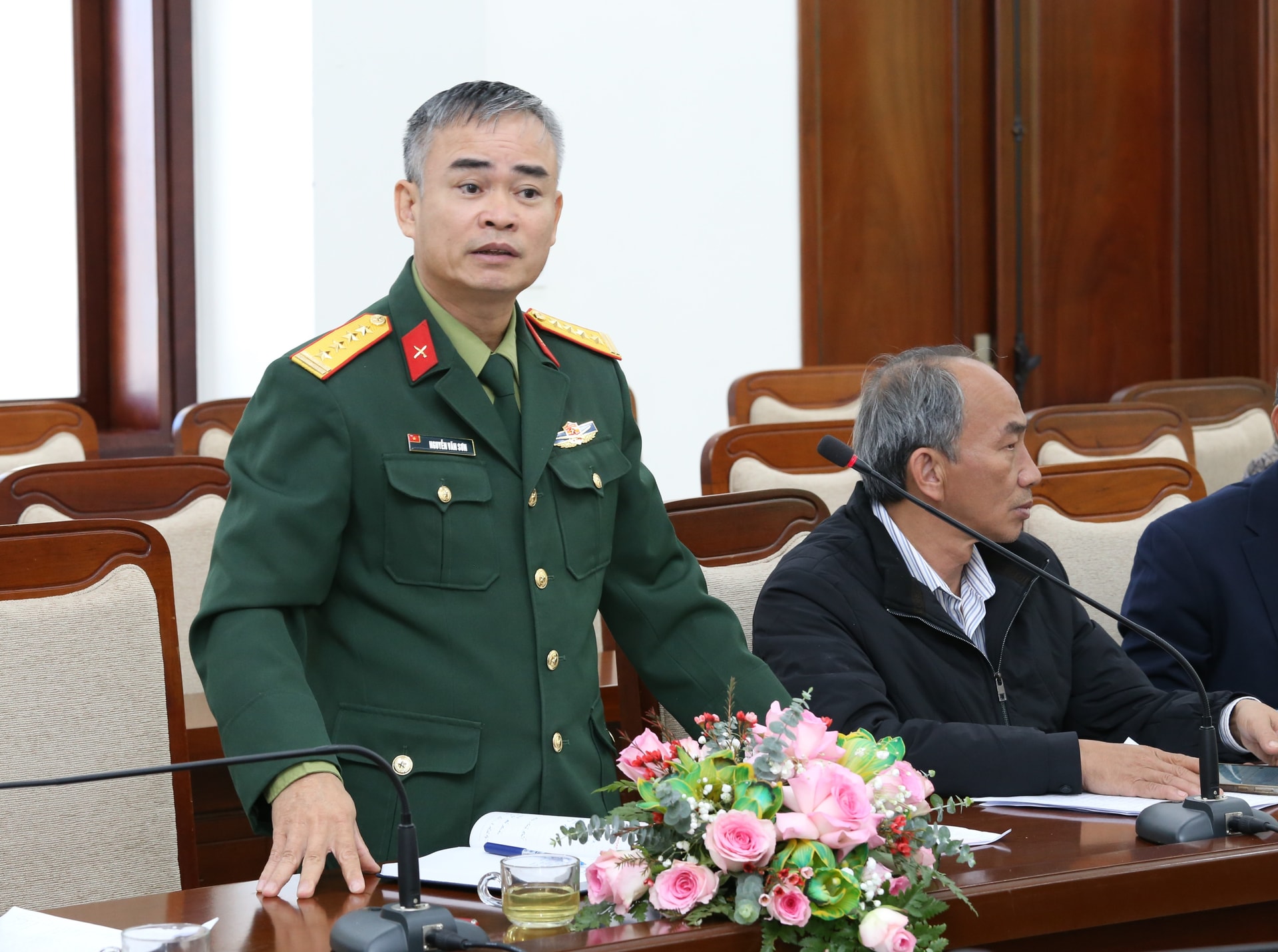 Đại tá Nguyễn Văn Sơn, Chính ủy Bộ CHQS tỉnh Lâm Đồng phát biểu ý kiến tại hội nghị