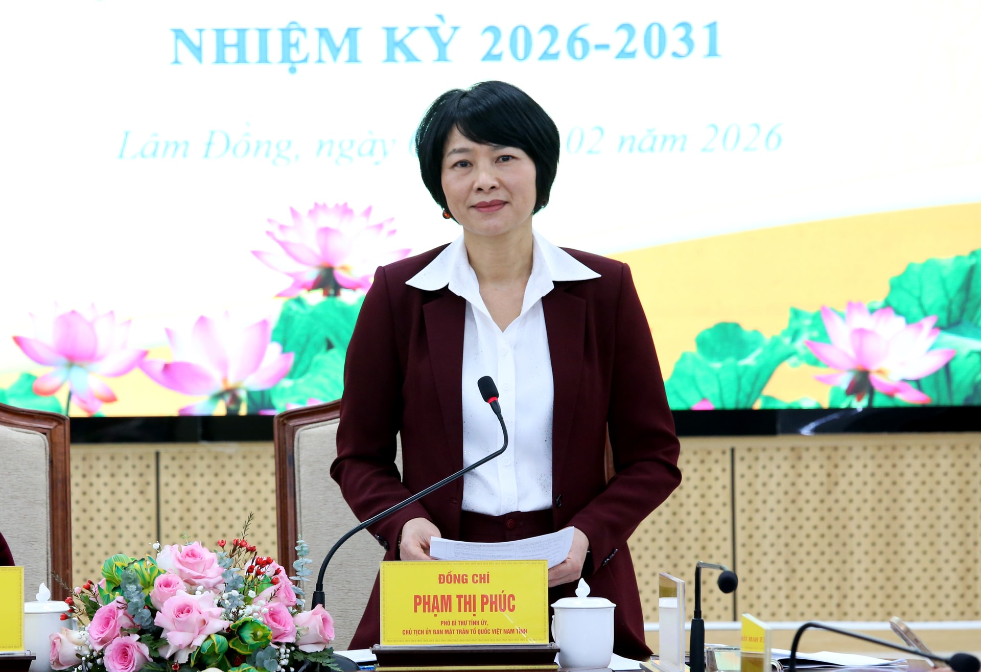 Đồng chí Phạm Thị Phúc, Phó Bí thư Tỉnh ủy, Chủ tịch Ủy ban MTTQ Việt Nam tỉnh Lâm Đồng phát biểu tại hội nghị