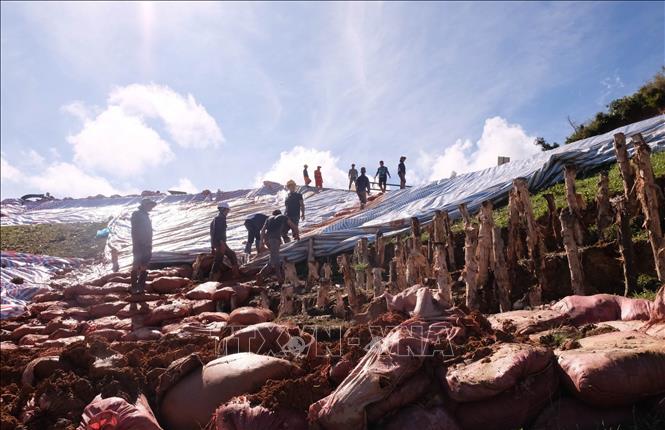 Lực lượng Cảnh sát cơ động Công an tỉnh Lâm Đồng hỗ trợ gia cố thân đập hồ thủy lợi Cay An trong sáng 8/11.