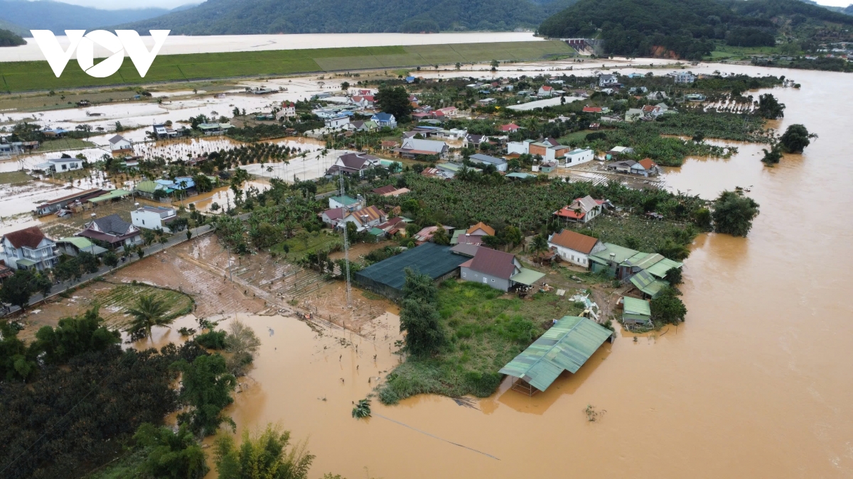 Toàn cảnh một khu dân cư ở hạ lưu sông Đa Nhim, trong đó có xã D’ran bị ngập sâu sau đợt mưa lũ; nhiều nhà cửa, vườn tược và đường sá chìm trong nước, thiệt hại nặng nề.
