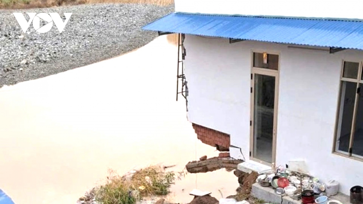 Tường móng một căn nhà ven sông bị dòng nước xoáy khoét rỗng, gây sập một phần nền và tường, đe dọa an toàn của người dân.