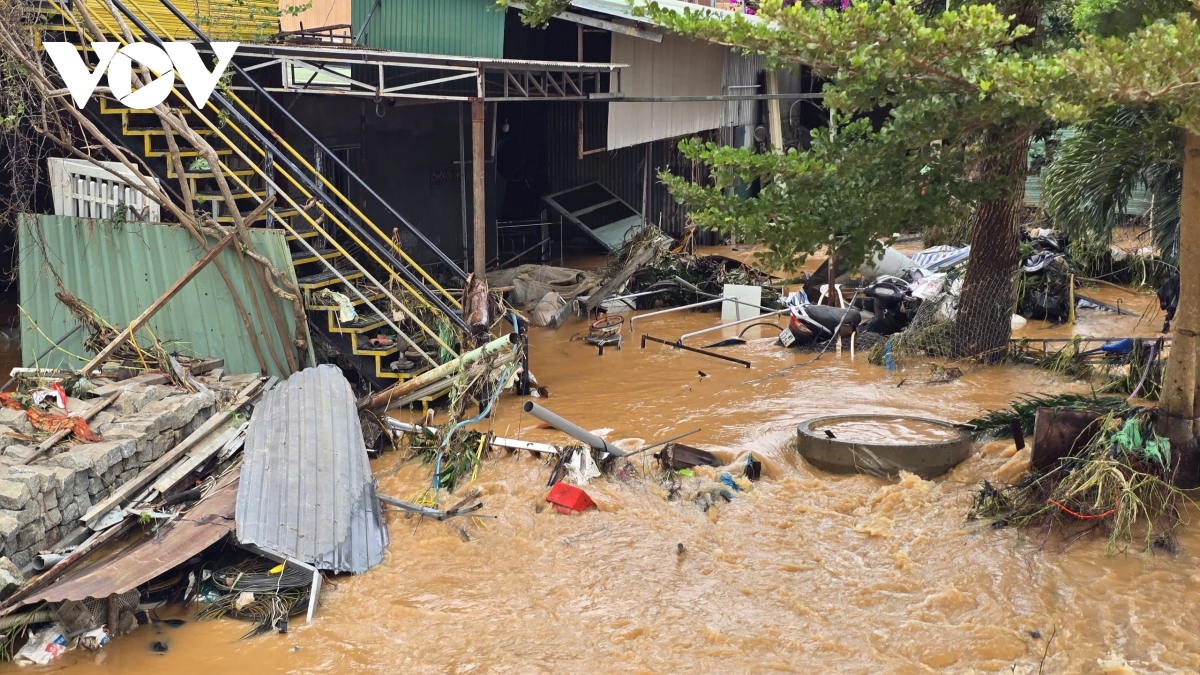 Khu vực nhà dân ven suối bị dòng nước lớn quét qua, cuốn trôi tài sản và làm hư hỏng nghiêm trọng kết cấu nhà cửa, cầu thang và nhiều phương tiện.