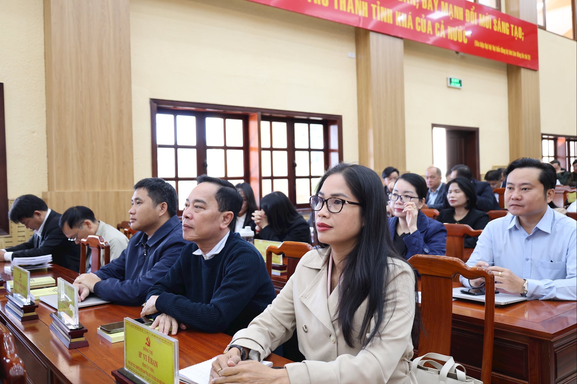 Các đồng chí: Y Thanh Hà Niê Kđăm, Ủy viên Ban Chấp hành Trung ương Đảng, Bí thư Tỉnh ủy, Trưởng đoàn ĐBQH tỉnh; Đặng Hồng Sỹ, Phó Bí thư Thường trực Tỉnh ủy; Hồ Văn Mười, Phó Bí thư Tỉnh ủy, Chủ tịch UBND tỉnh;Bùi Thắng, Phó Bí thư Tỉnh ủy; Lưu Văn Trung, Phó Bí thư Tỉnh ủy dự và chủ trì Hội nghị.