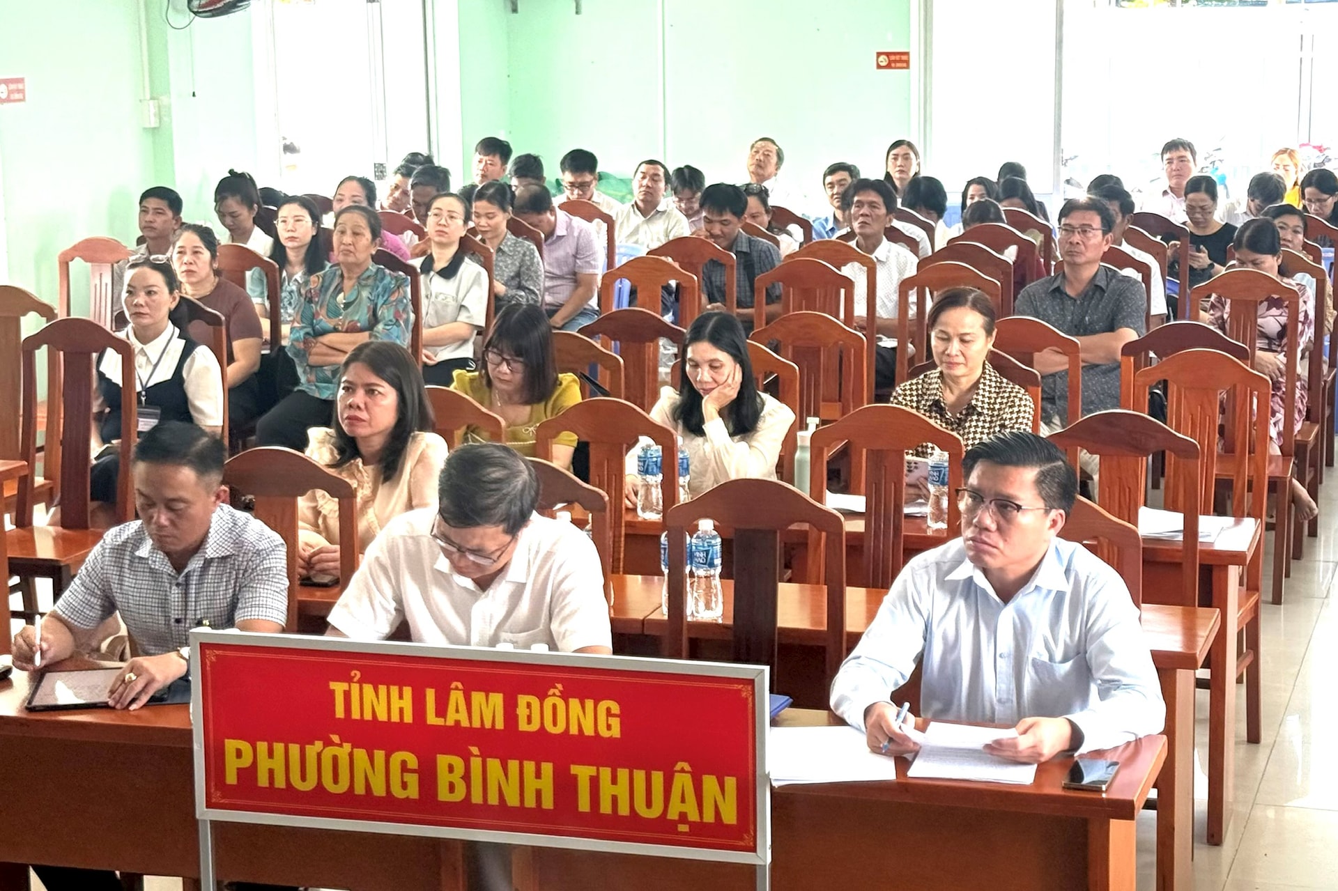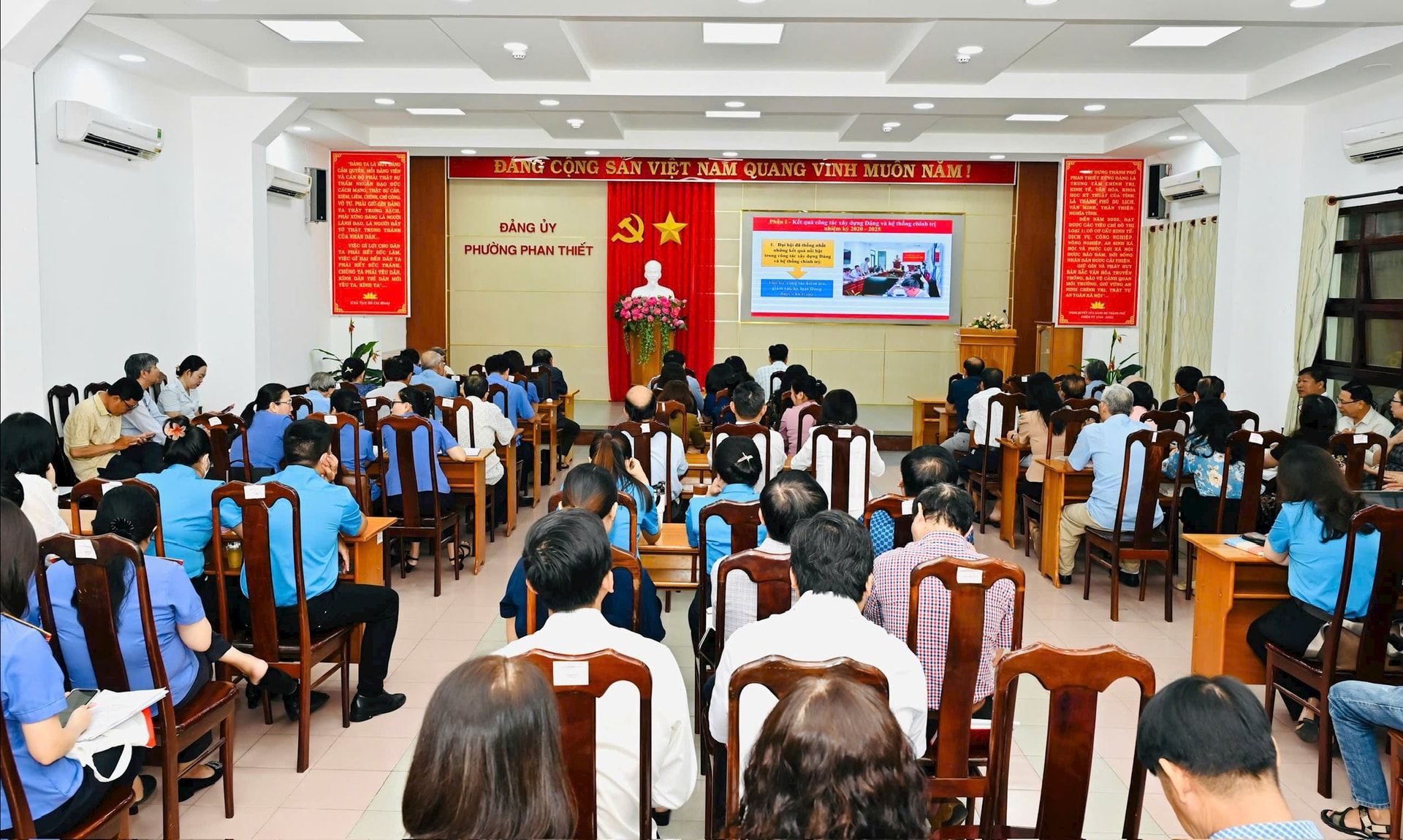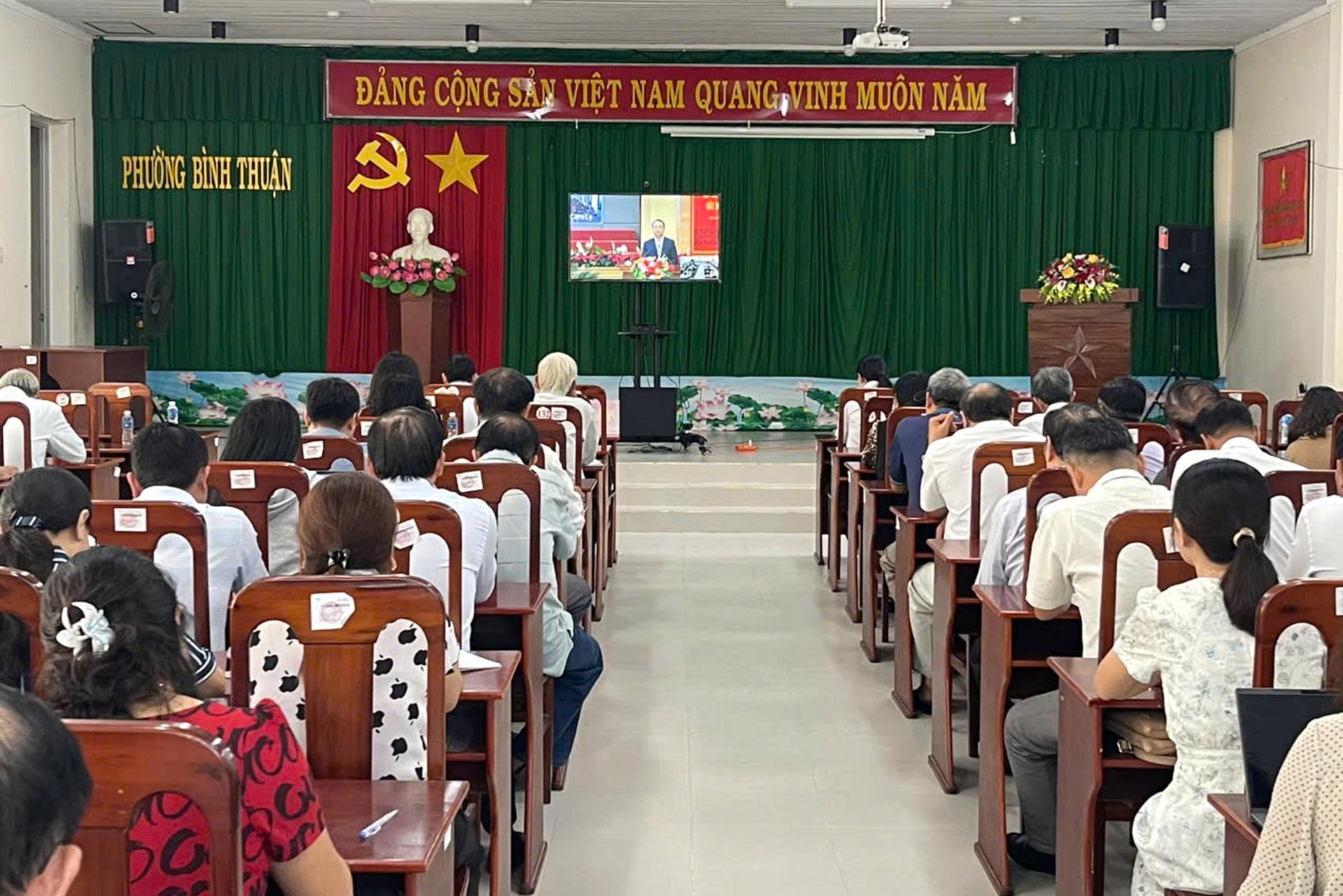 Đảng viên tham dự học tập Nghị quyết tại Hội trường Đảng ủy phường Bình Thuận. Ảnh: H. Lan