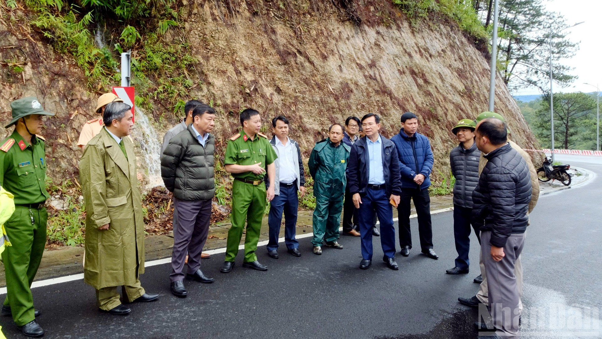 Phó Chủ tịch Ủy ban nhân dân tỉnh Lâm Đồng Nguyễn Hồng Hải (giữa) kiểm tra hiện trường sạt lở trên đèo Prenn sáng 17/11.