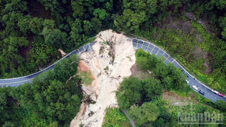 Khu vực sạt lở tạo nên hố sâu và rộng so với mặt đường đèo.