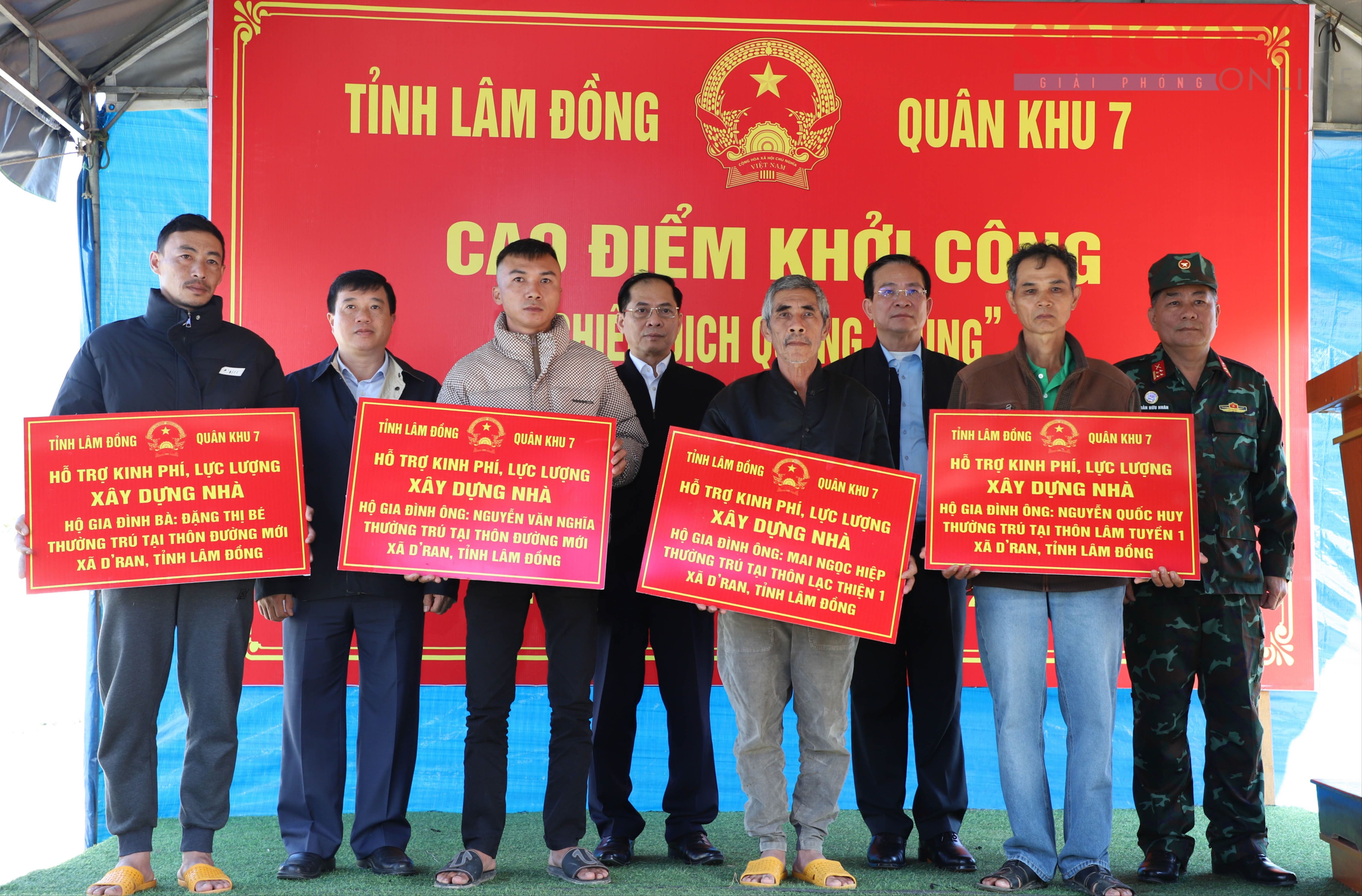 Phó Thủ tướng Bùi Thanh Sơn cùng lãnh đạo Bộ Tư lệnh Quân khu 7 và tỉnh Lâm Đồng trao biểu trưng hỗ trợ kinh phí, lực lượng cho các hộ dân trên địa bàn xã D’ran, tỉnh Lâm Đồng. Ảnh: ĐOÀN KIÊN