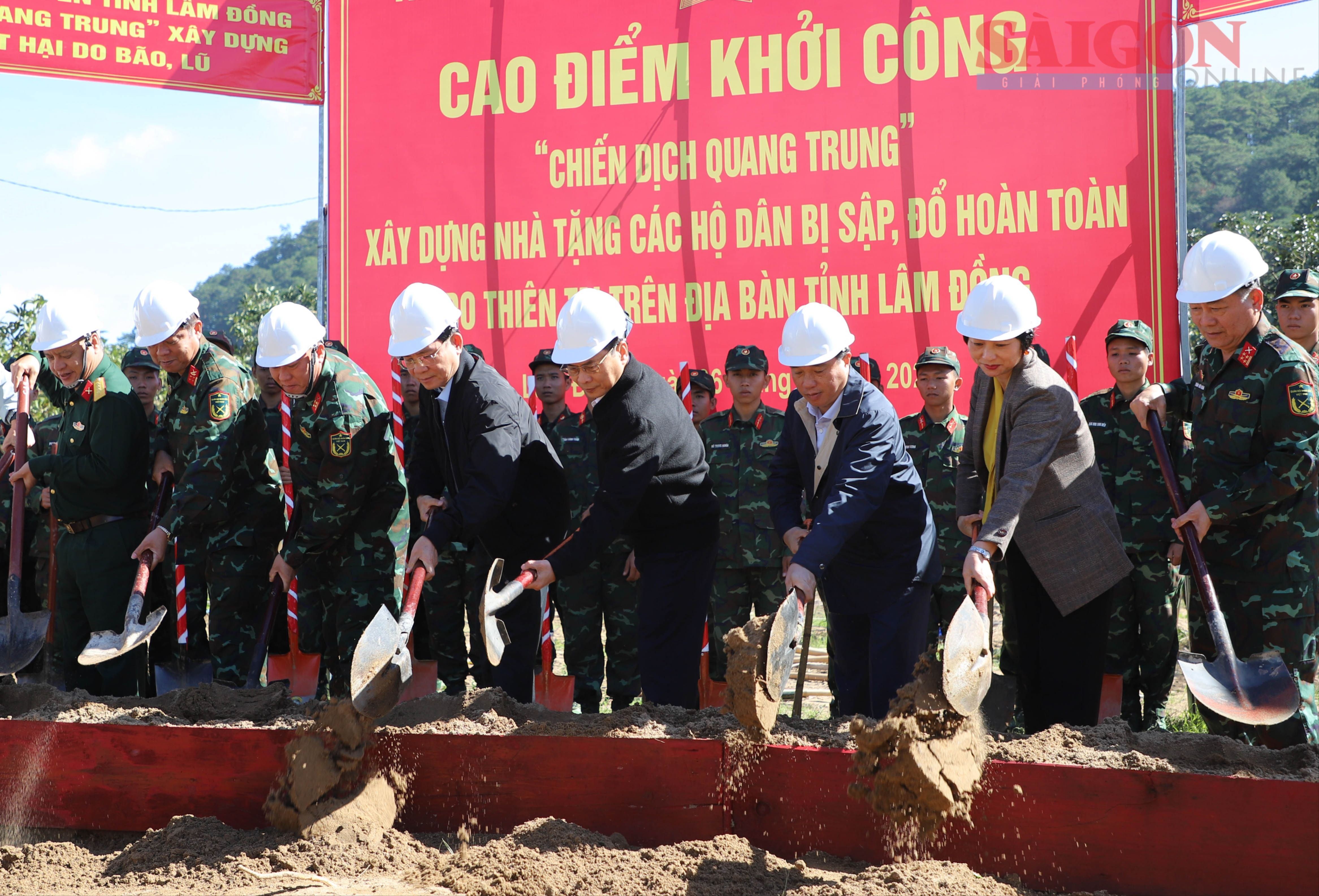 Phó Thủ tướng Bùi Thanh Sơn cùng lãnh đạo Bộ Tư lệnh Quân khu 7 và tỉnh Lâm Đồng thực hiện nghi thức khởi công nhà các hộ dân trên địa bàn xã D’ran, tỉnh Lâm Đồng. Ảnh: ĐOÀN KIÊN