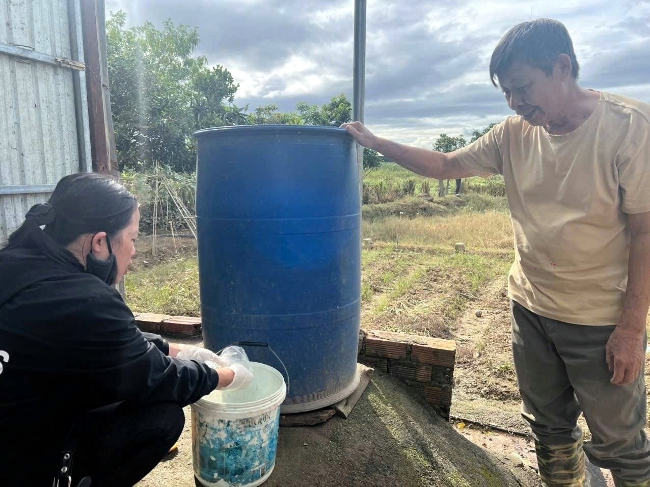Cán bộ y tế hướng dẫn người dân vùng ngập xử lý nguồn nước sinh hoạt để đảm bảo sử dụng nguồn nước sạch phòng dịch bệnh tại xã Đức Trọng