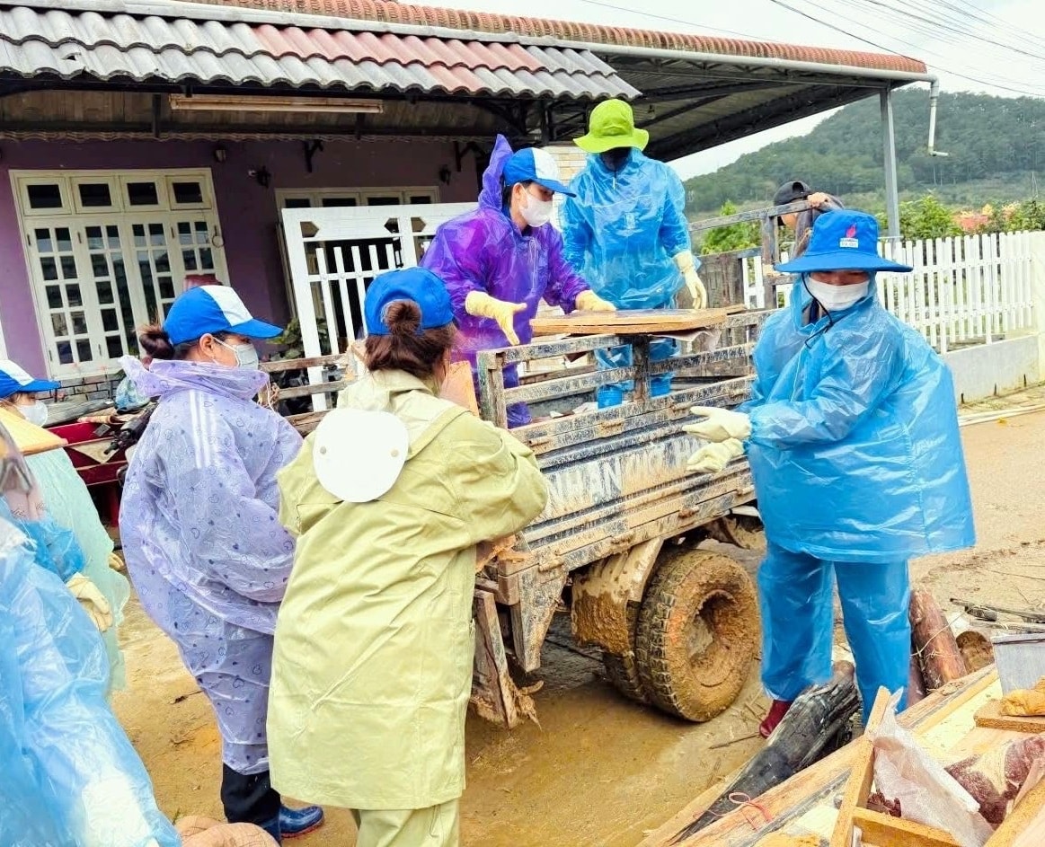 Các cô giáo ở xã Đơn Dương tăng cường giúp dân xã D'ran dọn dẹp vệ sinh môi trường ngay sau mưa lũ