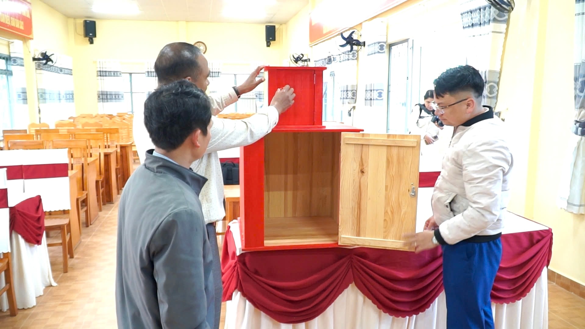 Thành viên Tổ bầu cử xã Lạc Dương tiến hành kiểm tra hòm phiếu và các điều kiện cơ sở vật chất phục vụ công tác bầu cử