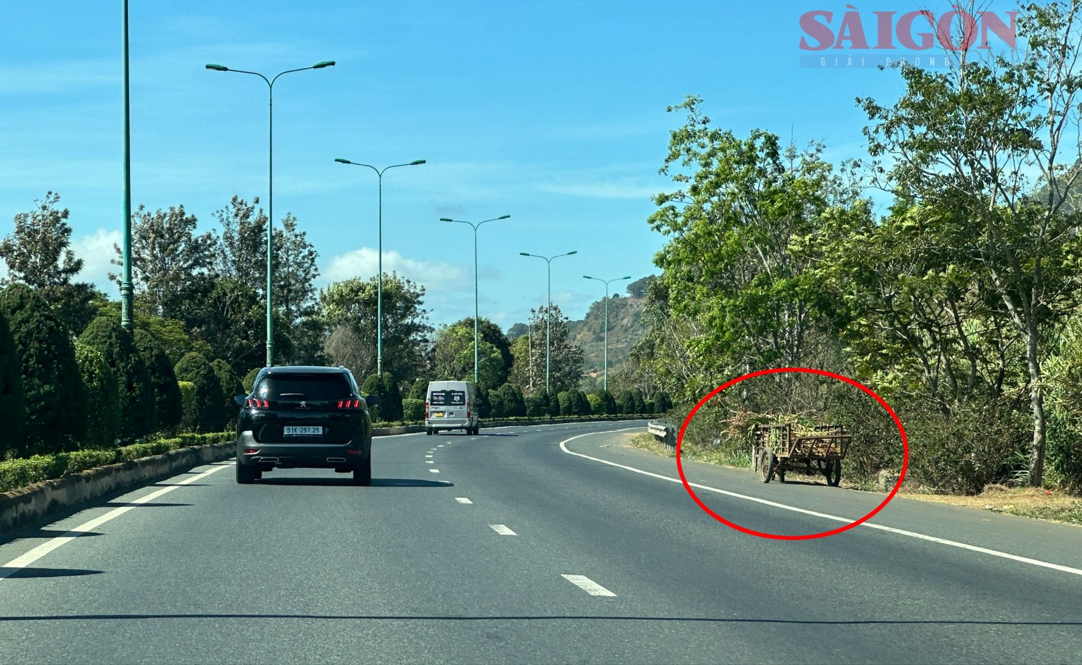 Do nhiều đoạn chưa có đường gom dân sinh nên người dân thường xuyên sử dụng phương tiện thô sơ, xe gắn máy di chuyển vào cao tốc Liên Khương - Prenn gây nguy hiểm cho các phương tiện khác. Ảnh: ĐOÀN KIÊN