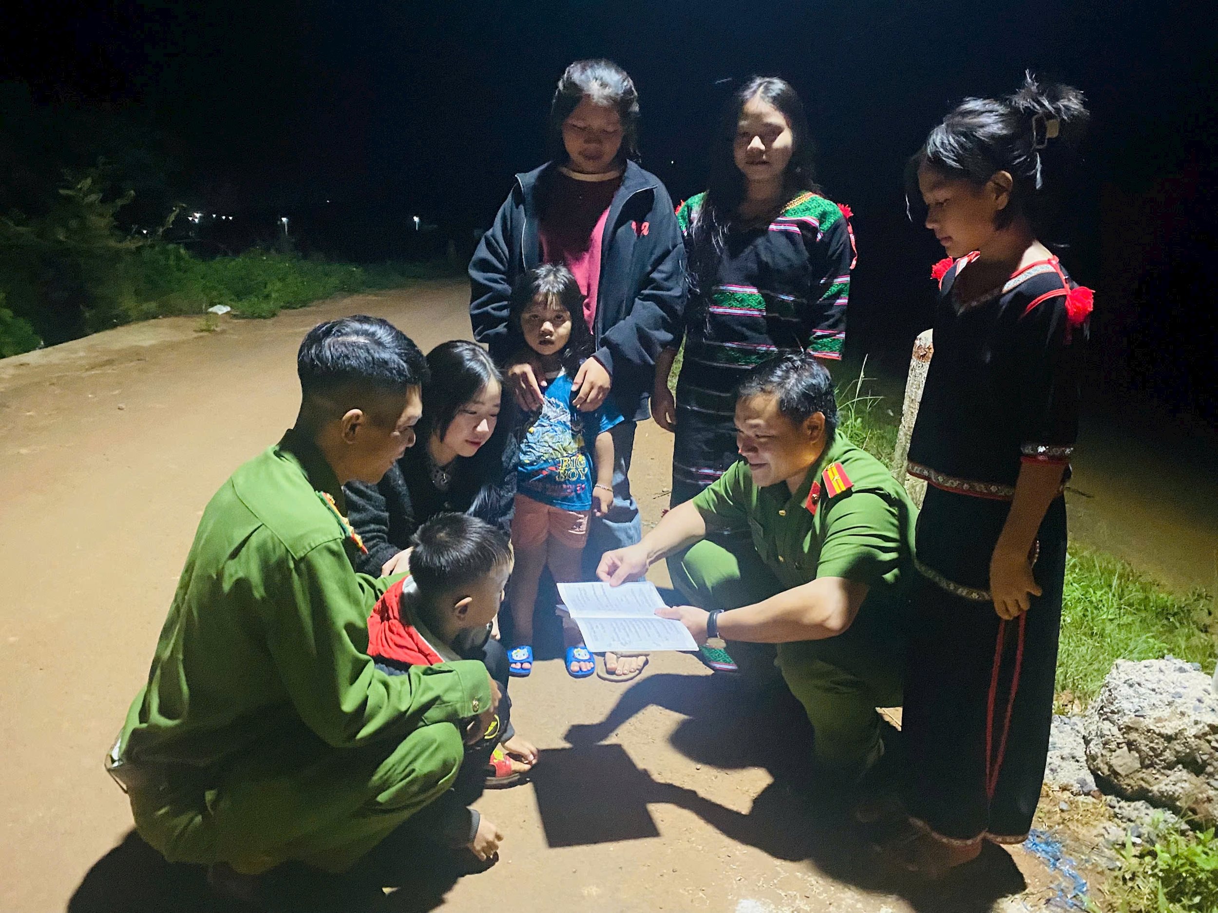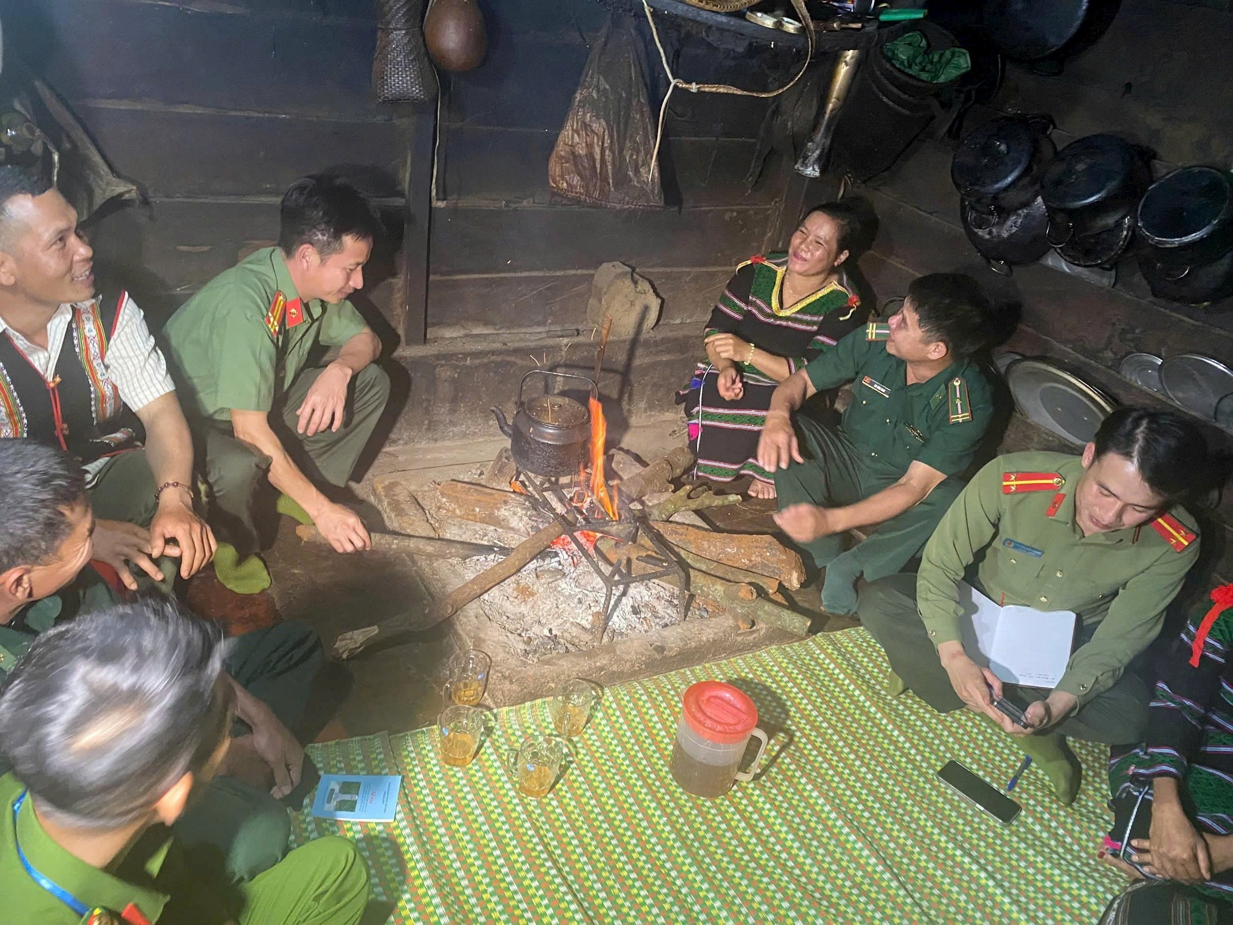 Một buổi chiều muộn, trong căn bếp nhỏ của gia đình ông Điểu El ở bon Bu Prăng 2A, bà con quây quần bên chén trà sau ngày lao động nương rẫy. Giữa không khí thân tình, cán bộ Công an xã nhẹ nhàng lồng ghép những nội dung pháp luật bằng lời kể mộc mạc, gắn với những câu chuyện thường nhật: đội mũ bảo hiểm khi đi xe máy, cảnh giác trước kẻ xấu lợi dụng, phòng tránh lừa đảo qua điện thoại.