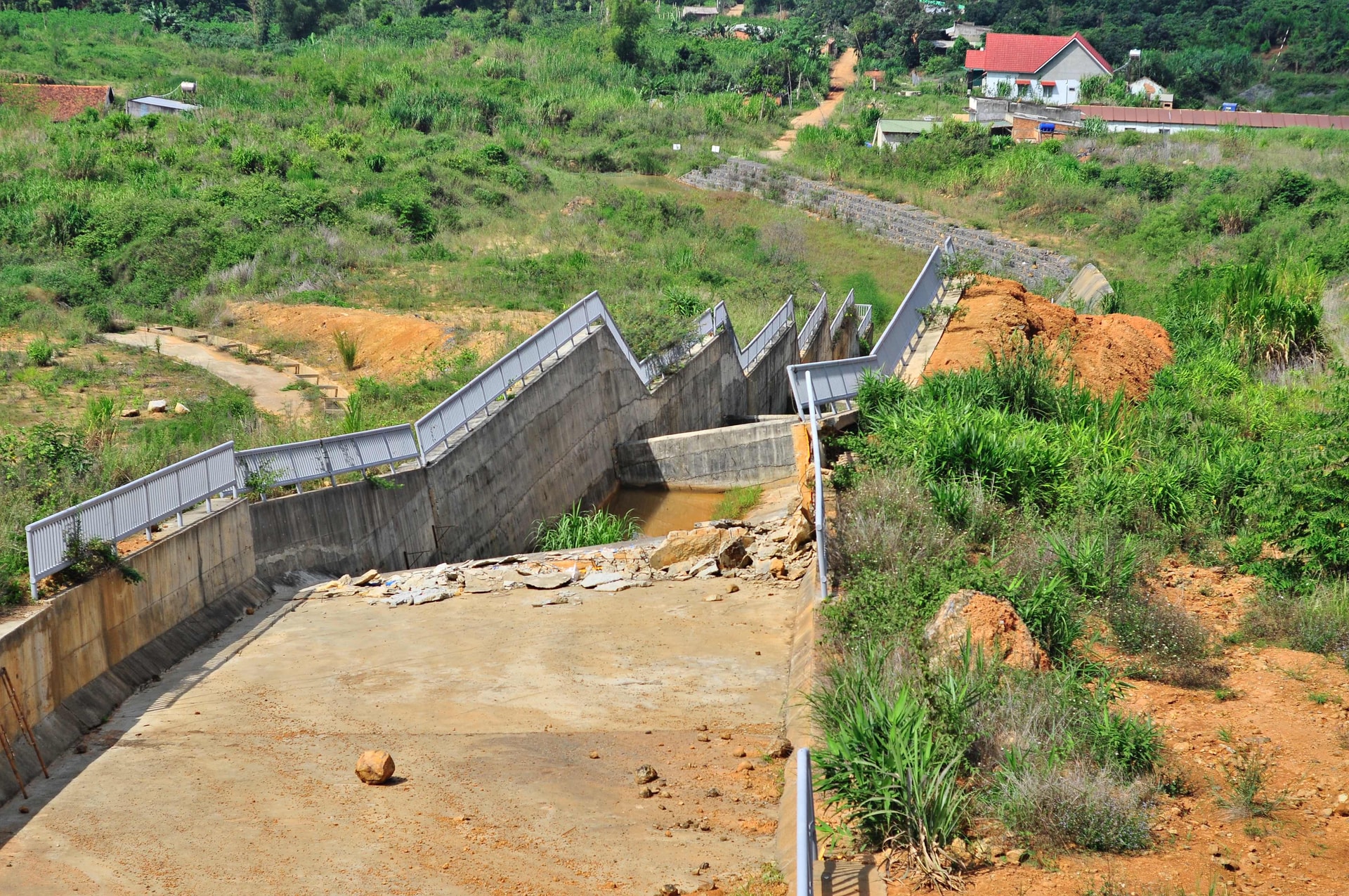 Công trình đã dừng thi công hơn 2 năm do sự cố sạt lở nghiêm trọng từ tháng 7/2023, gây hư hỏng nhiều hạng mục và lãng phí lớn. Sự cố sạt lở, sụt lún tại khu vực dự án được ghi nhận từ tháng 7/2023 và kéo dài sang các năm 2024–2025, ảnh hưởng hơn 12,7ha đất, làm hư hỏng tràn xả lũ, tác động đến nhà cửa của người dân xung quanh.