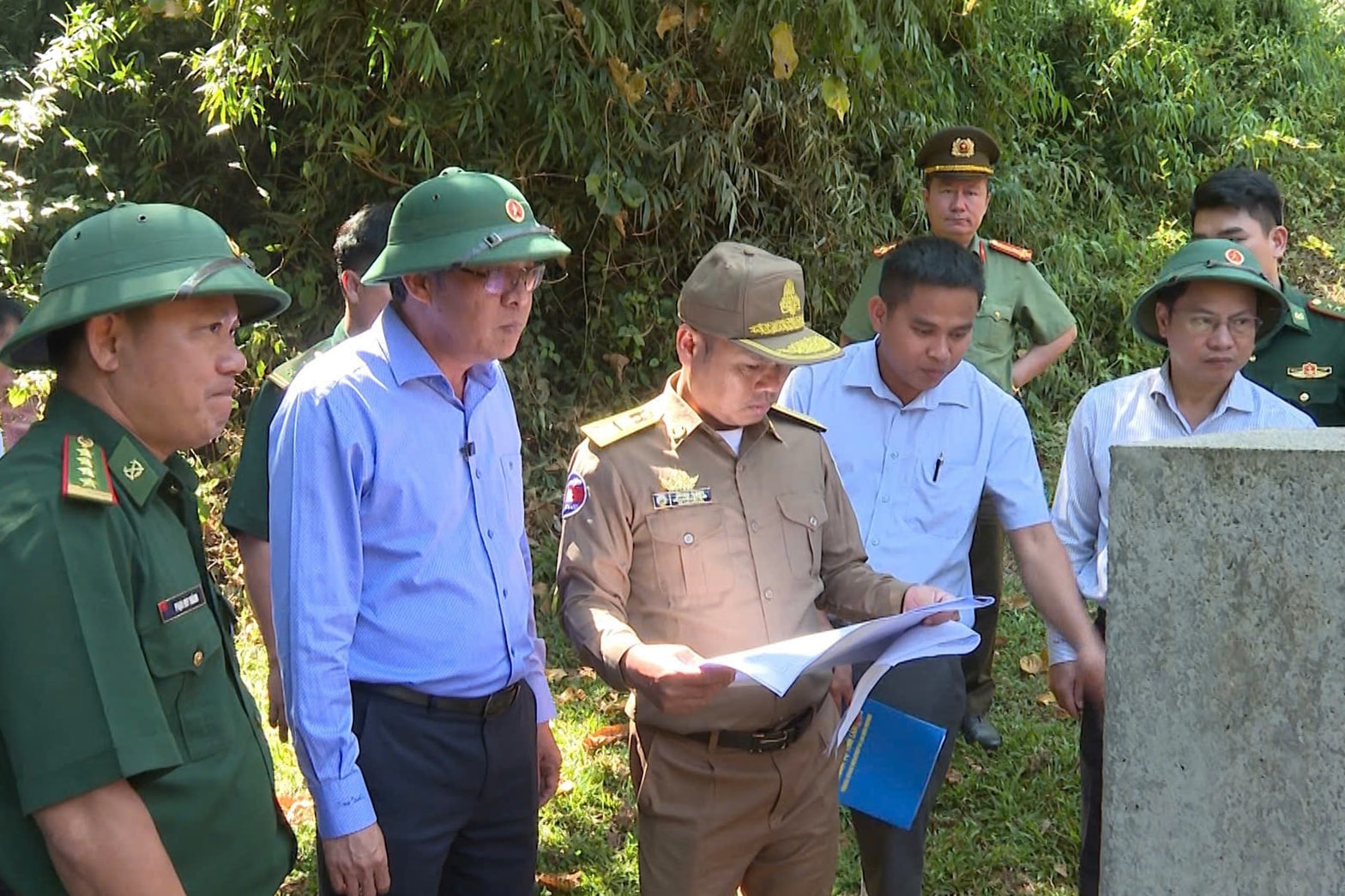 Tại buổi khảo sát, đoàn công tác của hai tỉnh Lâm Đồng và Mondulkiri đã phối hợp kiểm tra thực địa tại các cột mốc và khu vực bờ suối biên giới trên tuyến biên giới Việt Nam - Campuchia.