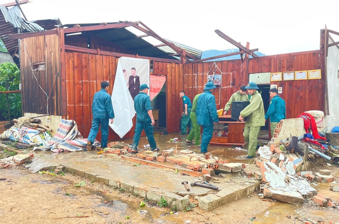Lực lượng chức năng giúp người dân thu dọn tài sản tại các căn nhà bị hư hại.