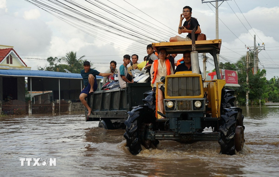 Chính quyền địa phương sử dụng máy cày di dời người dân ở xã Hàm Thuận Bắc (tỉnh Lâm Đồng) đến nơi an toàn. (Ảnh: Hồng Hiếu/TTXVN)
