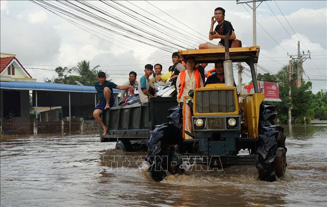 Chính quyền địa phương sử dụng máy cày di dời người dân ở xã Hàm Thuận Bắc (tỉnh Lâm Đồng) đến nơi an toàn.