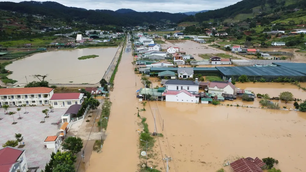 Một đoạn Quốc lộ 20, gần đèo Prenn thuộc xã Hiệp Thạnh, bị ngập cục bộ ngày 17-11, hiện các phương tiện lưu thông bình thường.