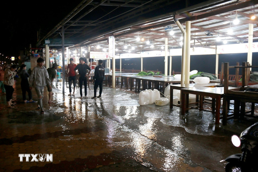 Tại khu vực quán ăn số 179, đường Nguyễn Đình Chiểu, sóng cao 4-5m liên tục đập vào gây hư hỏng công trình hàng rào gỗ của quán. Nước biển chảy tràn vào trong quán và tràn ra đường Nguyễn Đình Chiểu.