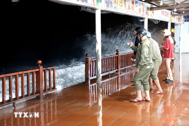 Theo ghi nhận của phóng viên TTXVN, tại khu phố Hàm Tiến 1 (phường Mũi Né), nước biển dâng cao, nhiều đợt sóng liên tục đập vào tuyến kè dọc bờ biển.