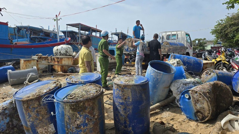 Nhiều thùng phuy trôi dạt vào bờ biển.