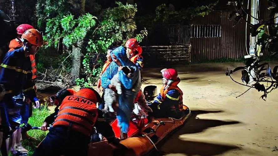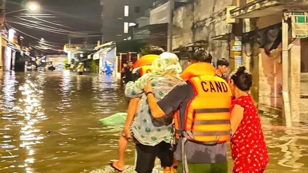 Lực lượng Công an phường Phan Thiết hỗ trợ dân vùng ngập đến nơi an toàn.