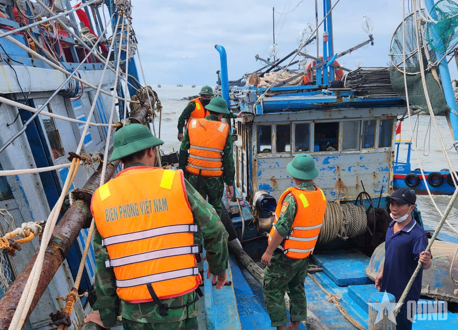 Bộ đội Biên phòng tỉnh Lâm Đồng hỗ trợ chủ tàu cá gia cố neo đậu đảm bảo an toàn.