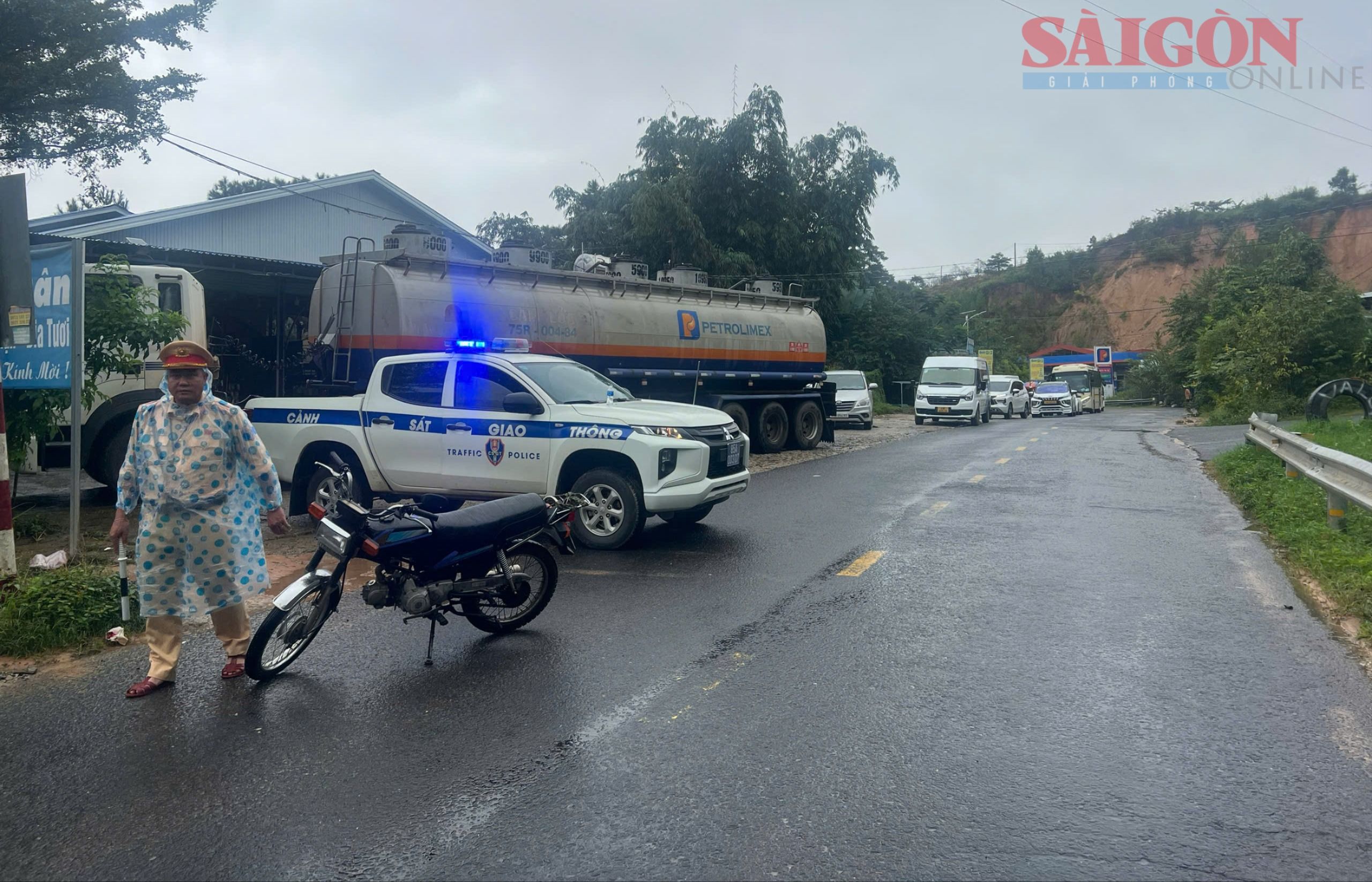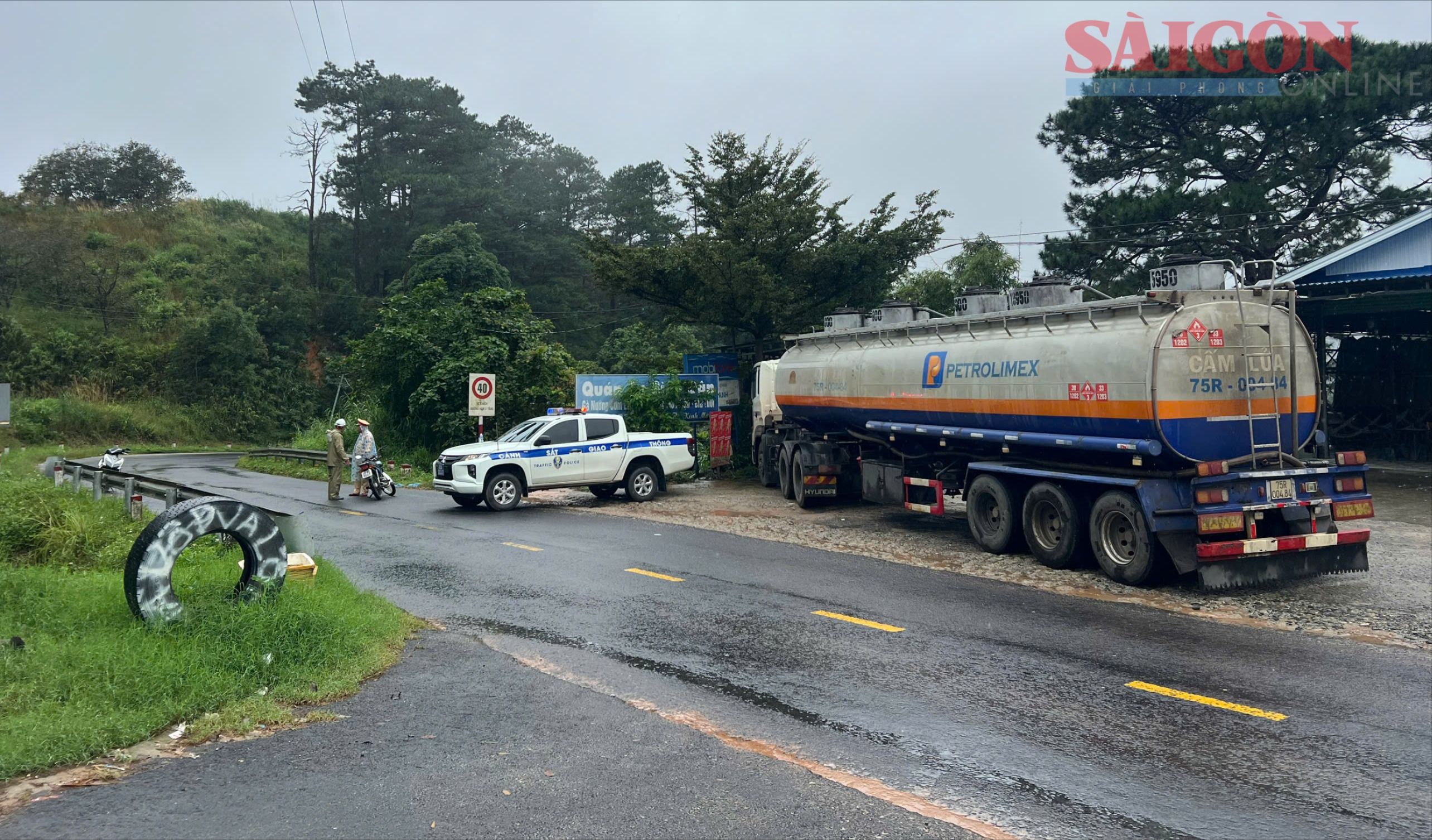 Lực lượng CSGT Công an tỉnh Lâm Đồng chốt chặn tại quốc lộ 27 gần khu vực đèo Sông Pha