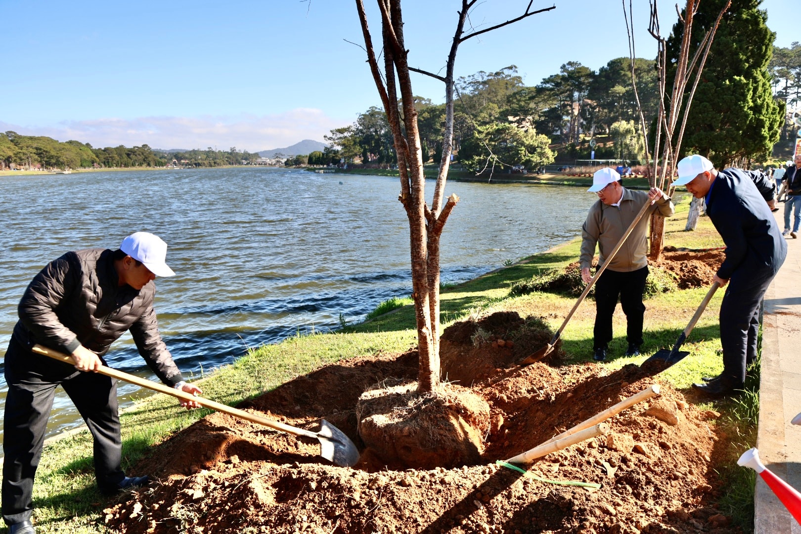 Các đồng chí Phó Chủ tịch UBND tỉnh Lê Trọng Yên, Võ Ngọc Hiệp, Đinh Văn Tuấn tham gia trồng cây mai anh đào ven Hồ Xuân Hương