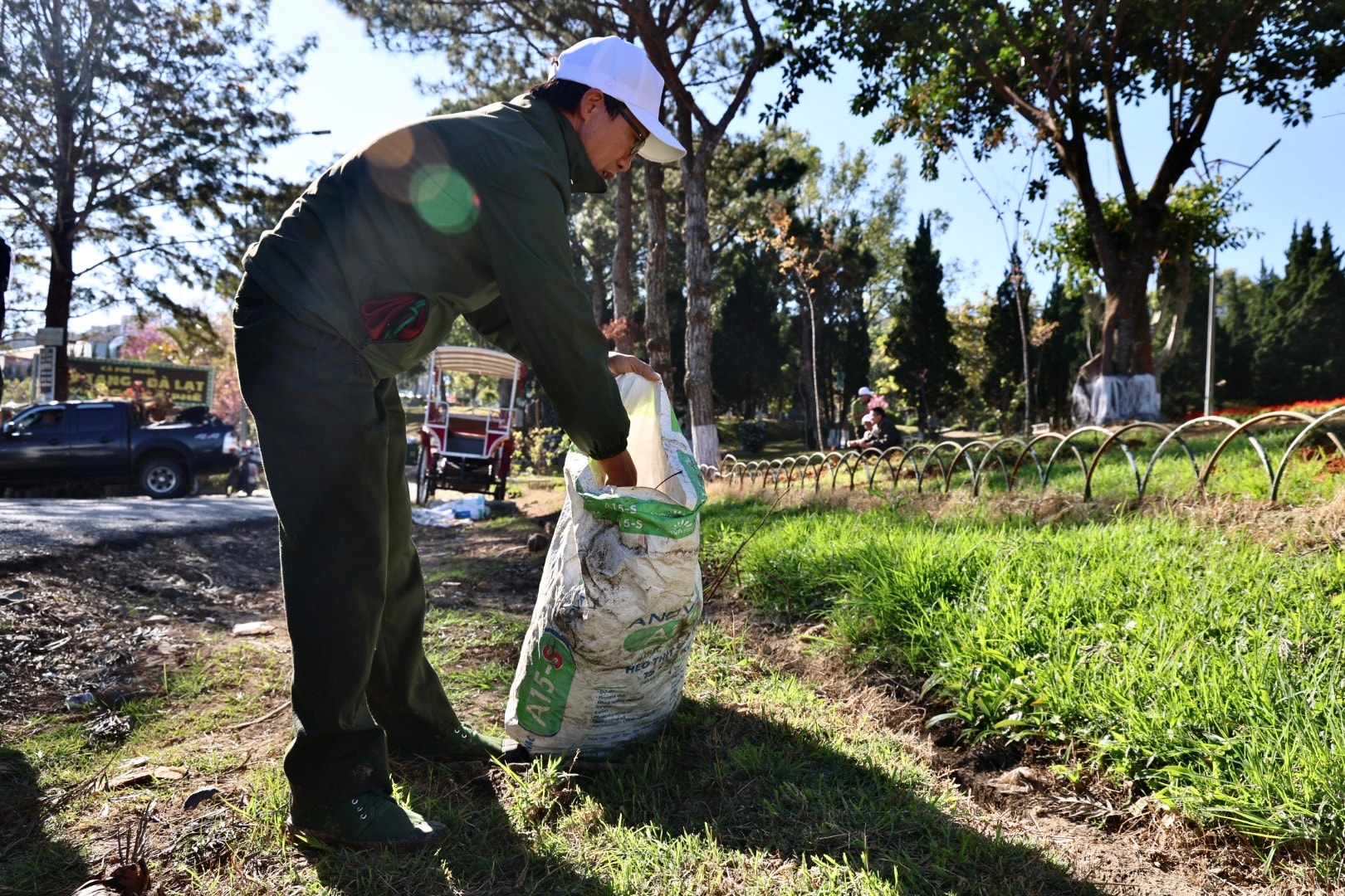 Lực lượng đoàn viên, thanh niên tham gia thu gom rác thải, làm sạch khu vực Quảng trường Lâm Viên và các tuyến đường lân cận