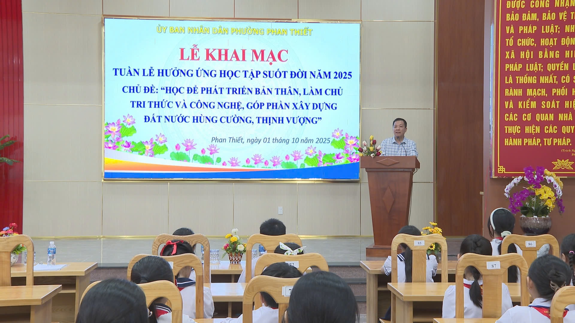 Tại phường Phan Thiết, khai mạc Tuần lễ hưởng ứng học tập suốt đời năm 2025 có đại diện lãnh đạo Đảng ủy, HĐND, UBND phường; các phòng, ban liên quan; Bí thư chi bộ, Tổ trưởng các tổ dân phố; cùng đại diện Ban giám hiệu và học sinh các trường tiểu học, THCS trên địa bàn.