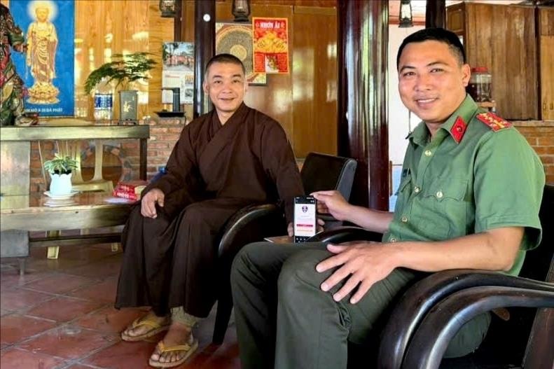 Cán bộ Công an xã Hòa Thắng tuyên truyền tiện ích của ứng dụng VNeTraffic cho trụ trì chùa Bình Sơn