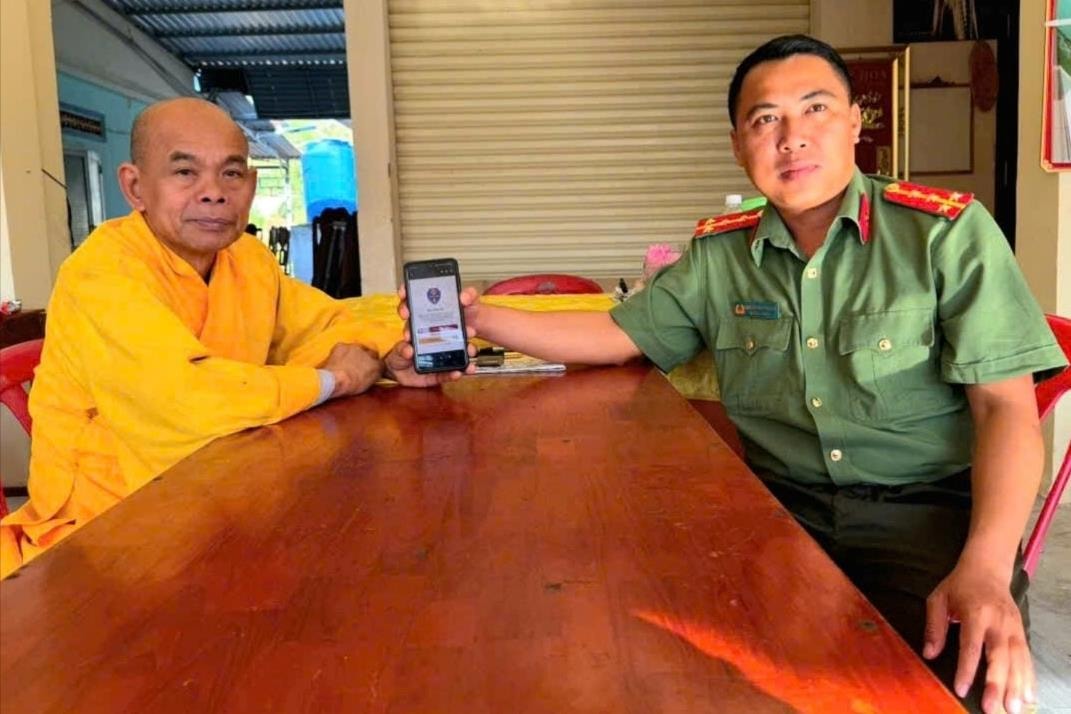 Cán bộ Công an xã Hòa Thắng tuyên truyền tiện ích của ứng dụng VNeTraffic cho trụ trì chùa Bình Nhơn