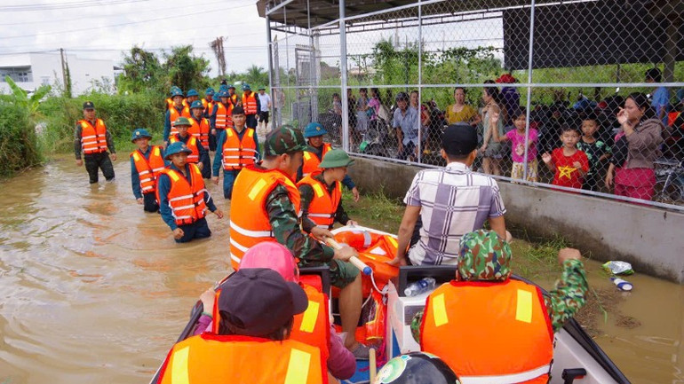 Lực lượng chức năng di dời người dân ra khỏi vùng ngập lụt.